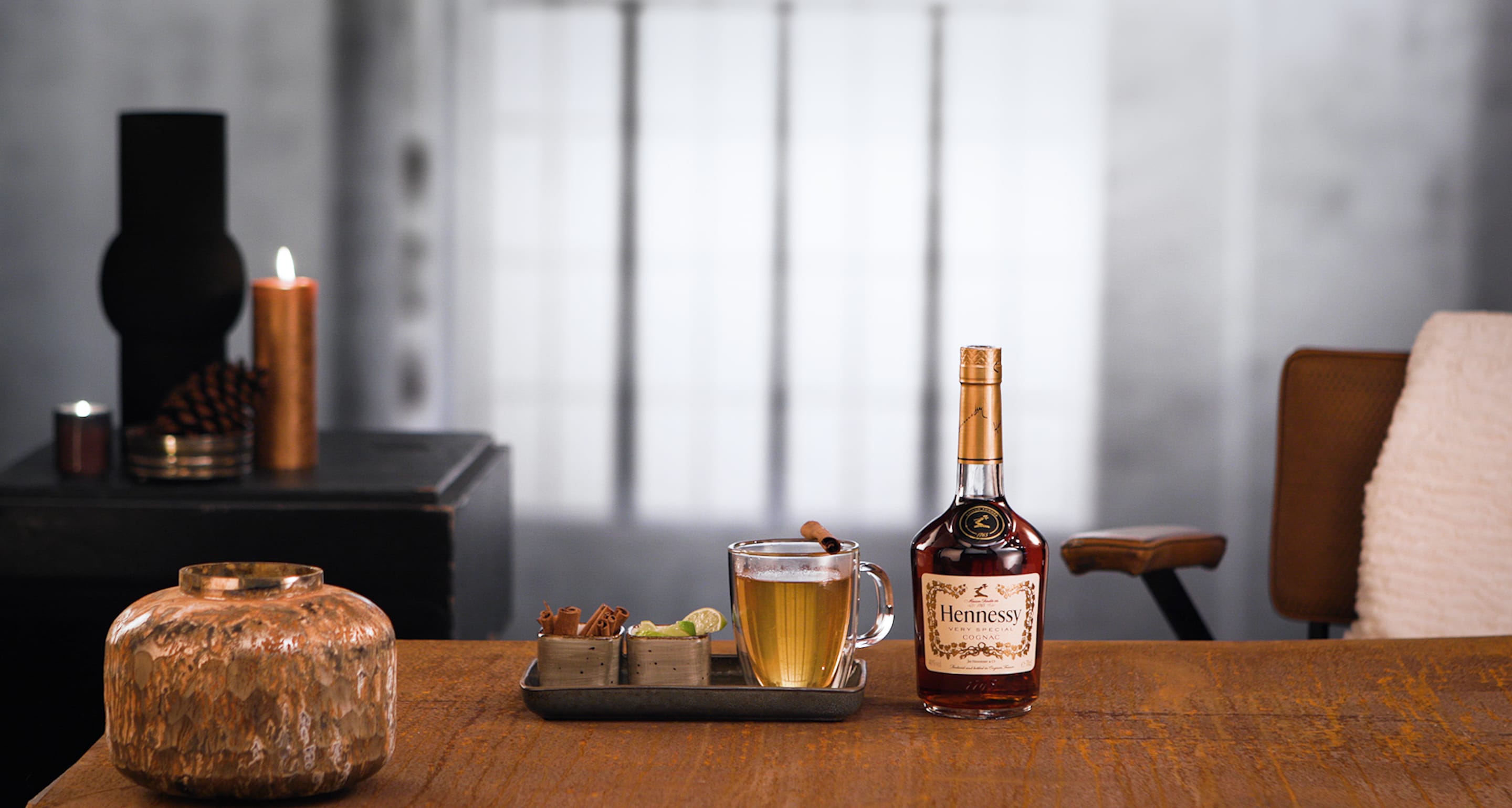 "The traditional warm drink for a cold winter day. Hennessy V.S plays perfectly with the spice of cinnamon, the tang of citrus, and the sweet touch of honey.