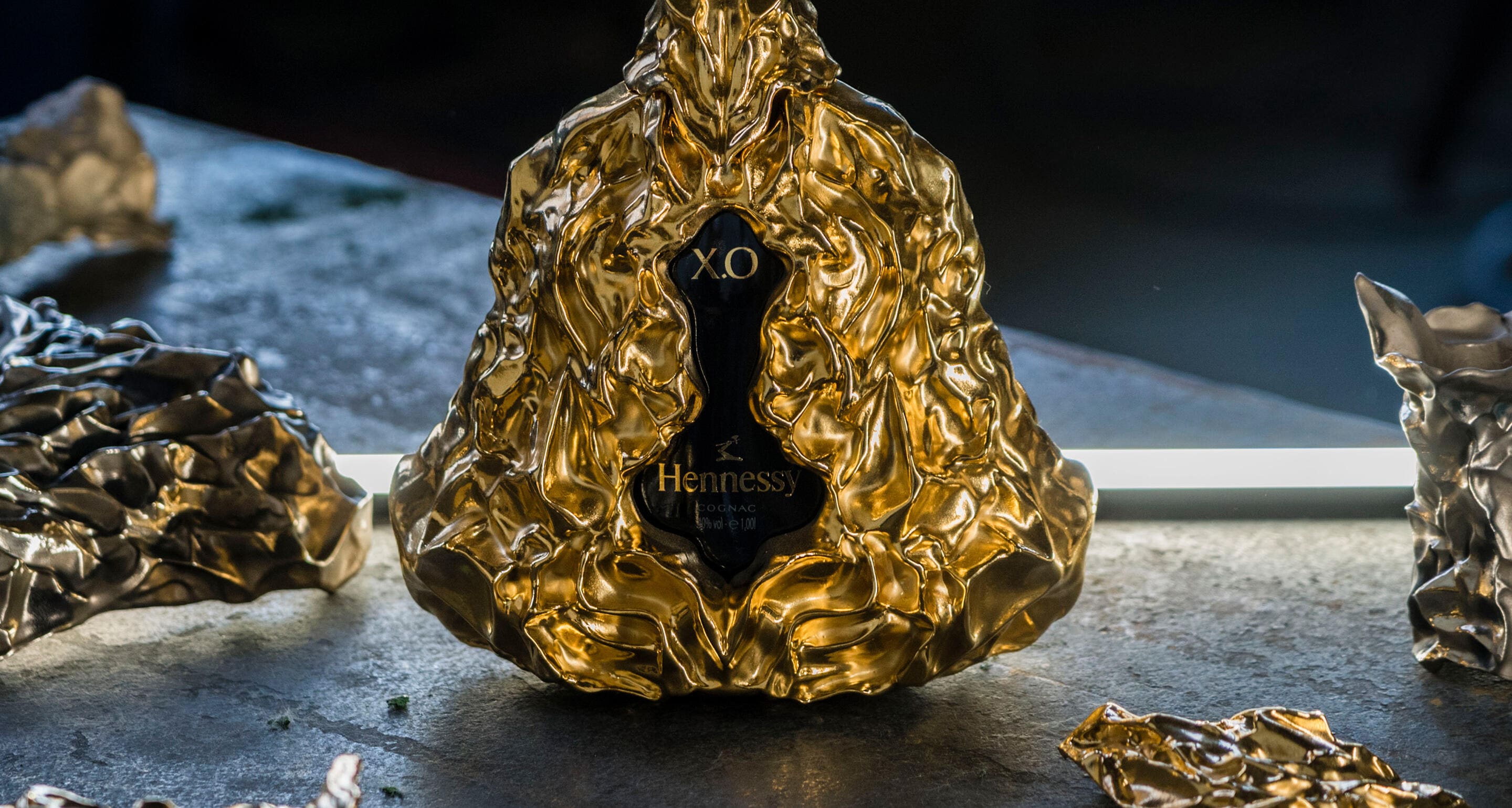 A l’occasion du 150ème anniversaire de Hennessy X.O, Frank Gehry a conçu une pièce exclusive. La carafe emblématique de Hennessy X.O est enveloppée dans un écrin plissé de bronze couvert d’or 24 carats et repose sur une sculpture de verre.