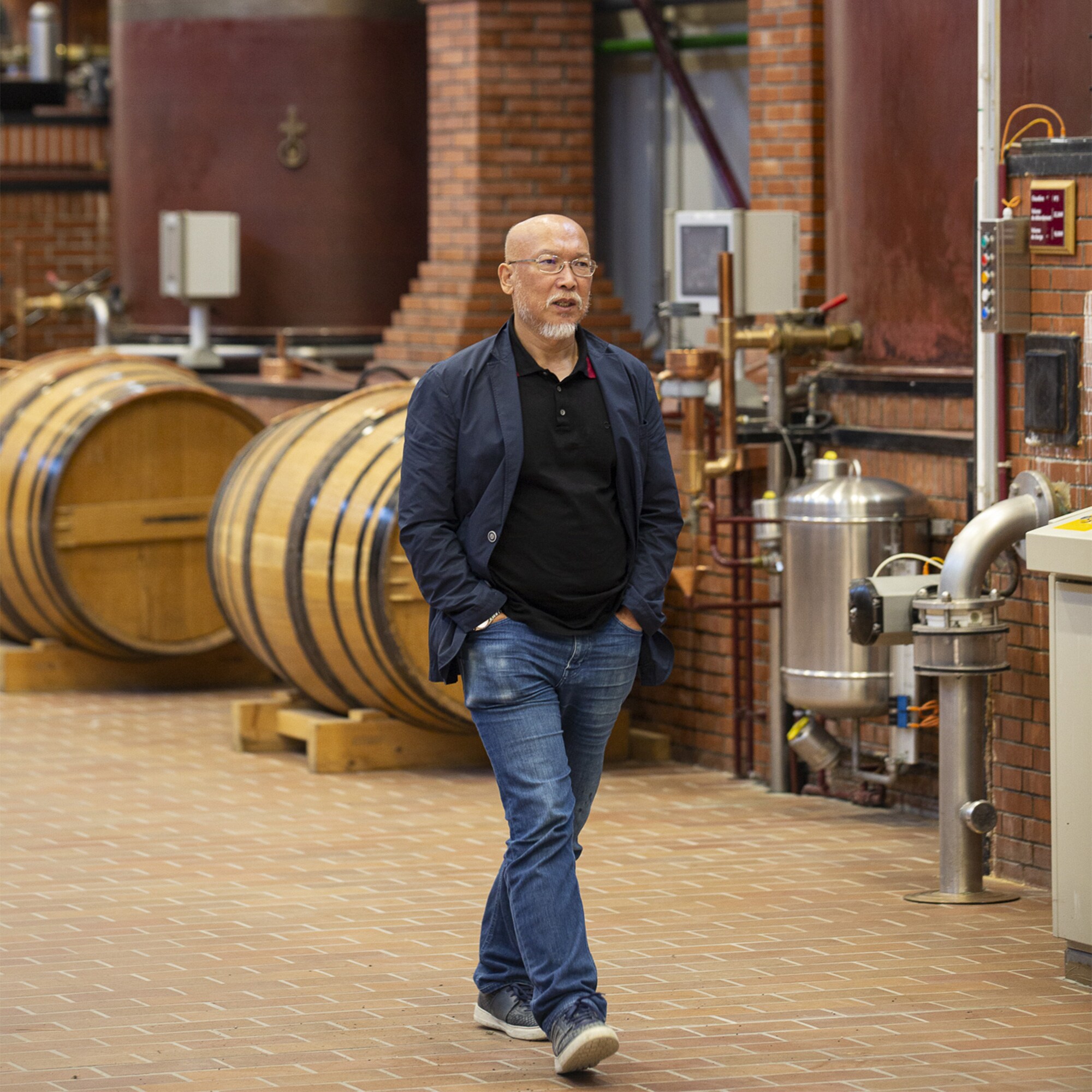 在離主幹道幾公里的地方,他發現自己身處創始人酒窖裡,在潮濕的環境中摸索,輕撫著承載著陳年生命之水的酒桶。「酒桶的聲音像鼓聲一樣美妙;創始人酒窖神秘的氛圍、陳年的生命之水,都給我留下了深刻的印象。」他透露,他與軒尼詩的共同特點是「所有創作都植根於傳統。」